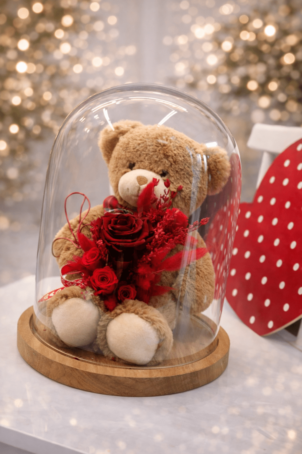 Disponible en retrait en boutique ou en livraison locale, selon les options proposées.🧸🌹 Cloche Ourson & Rose Éternelle – Une douceur qui dure