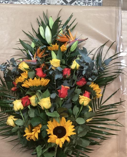 La Gerbe Funéraire Coucher de Soleil composée de Fleurs Jaunes, oranges et blanches est confectionnée à la main par nos artisans fleuristes dans nos boutiques Les Fleurs de Tonton.